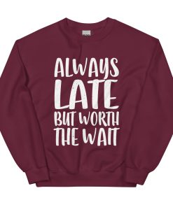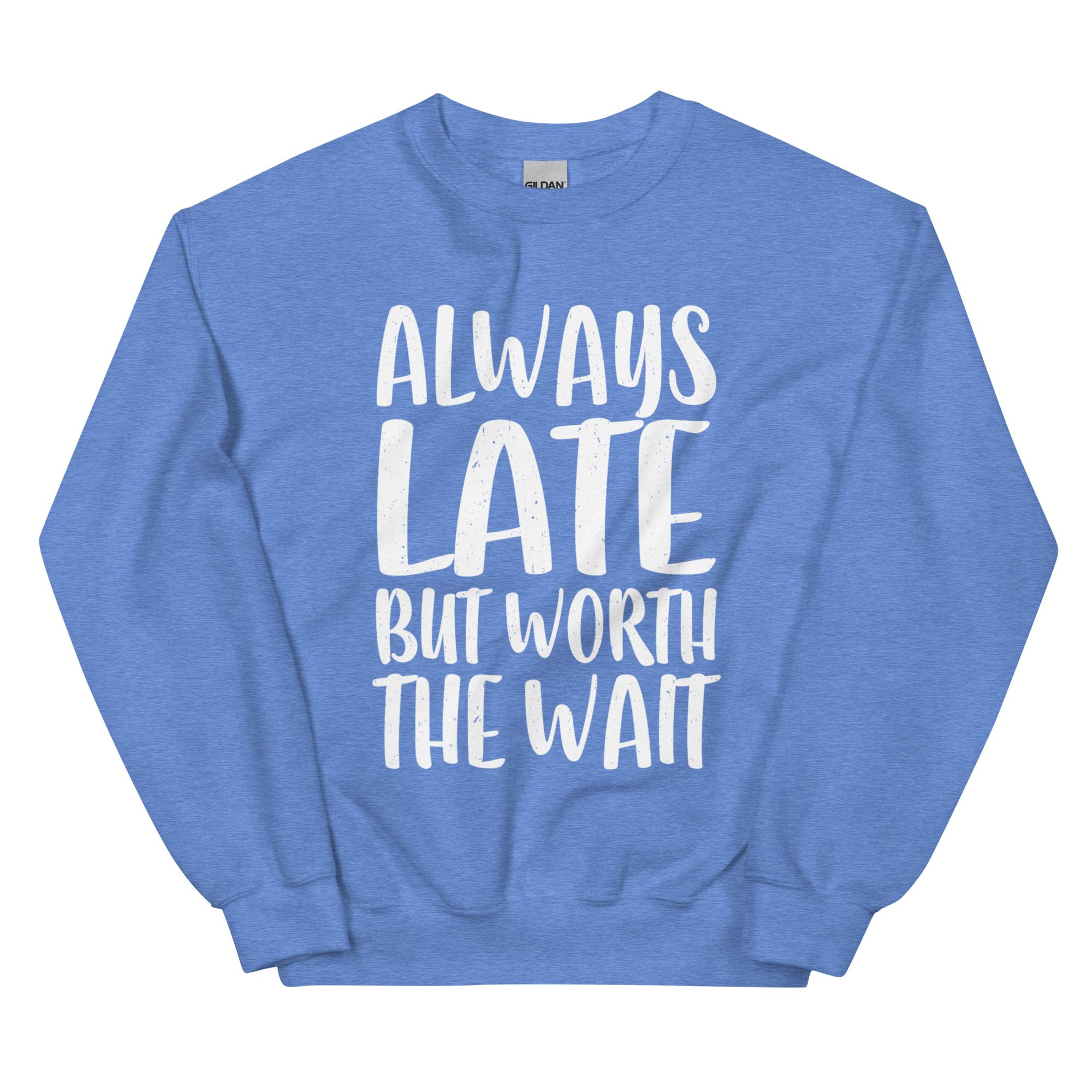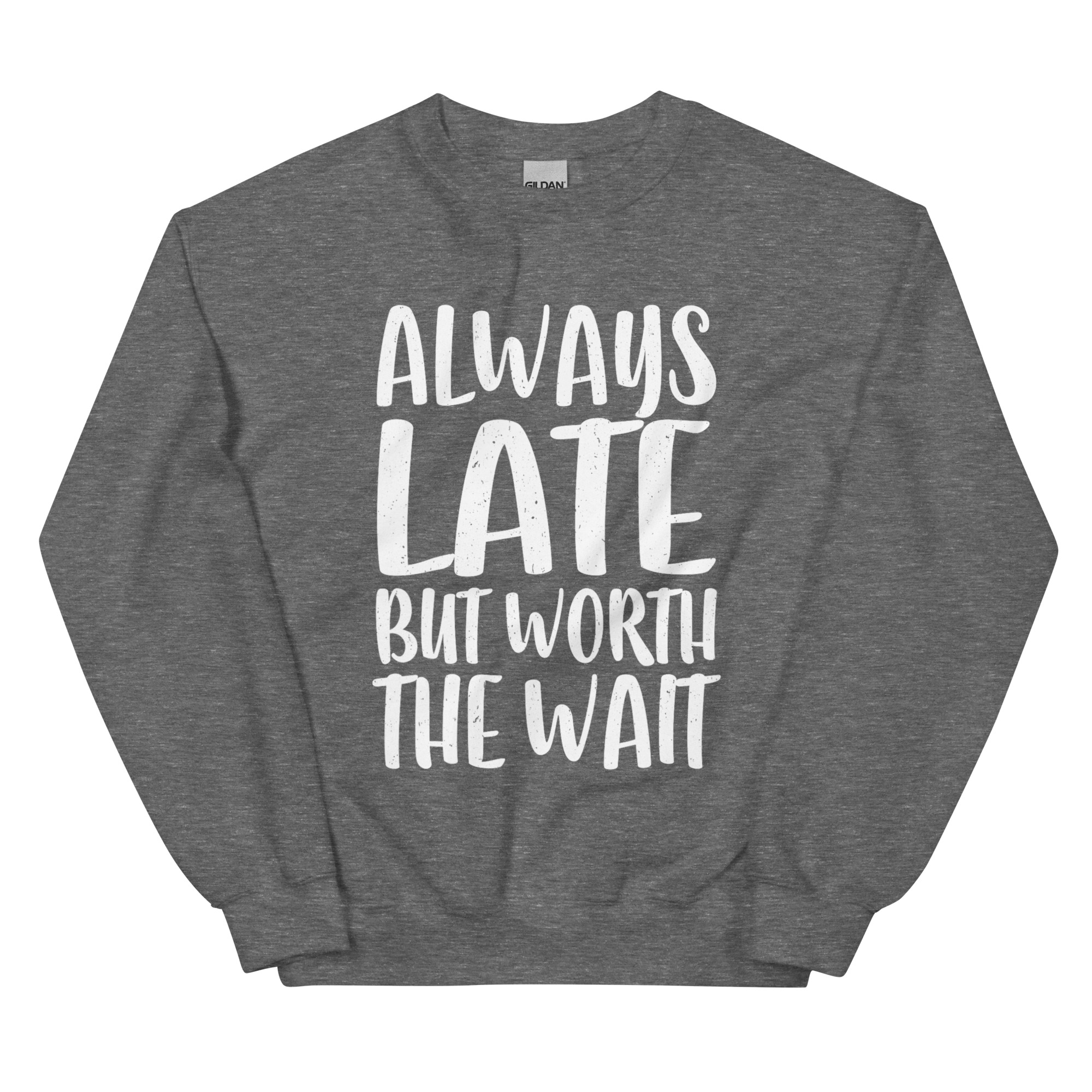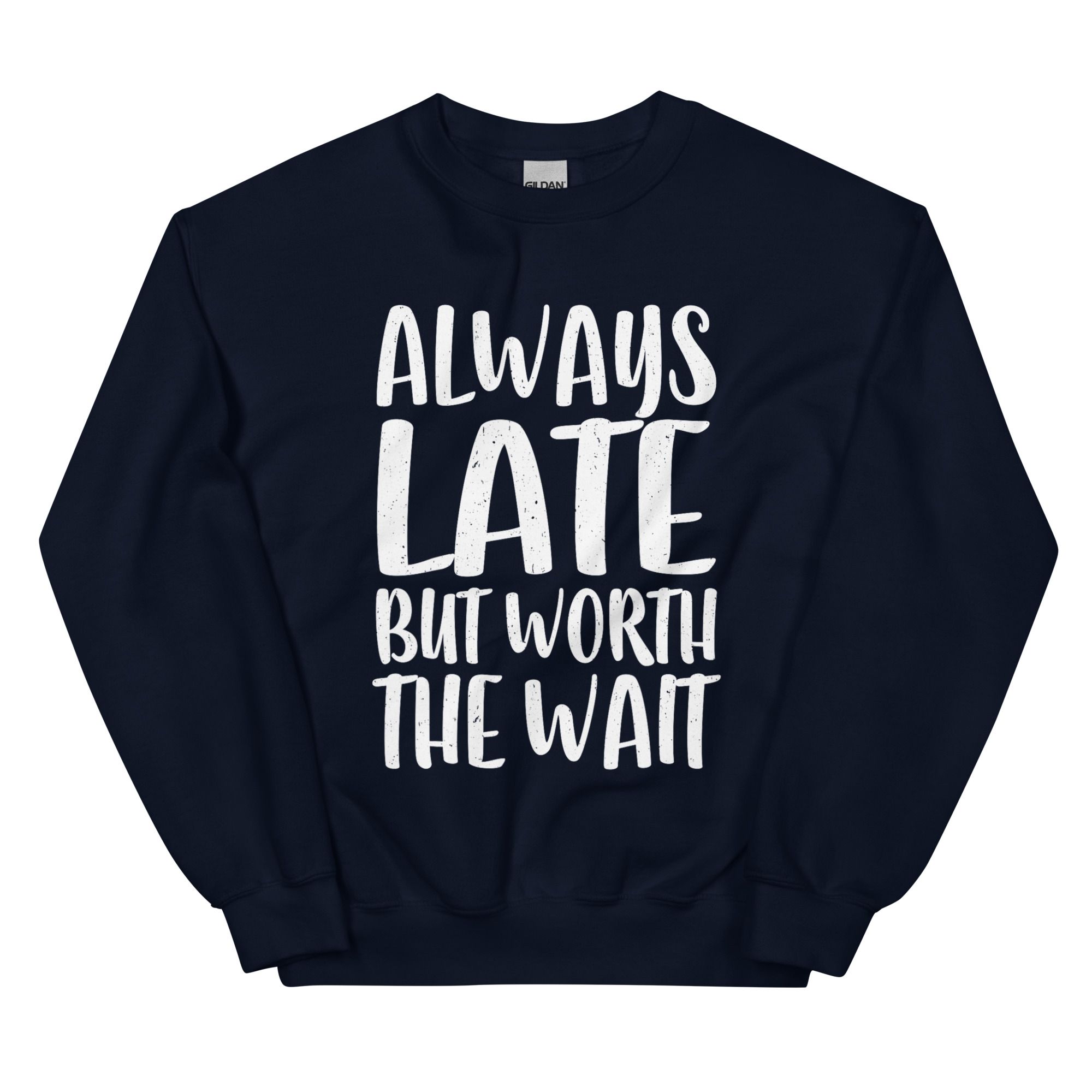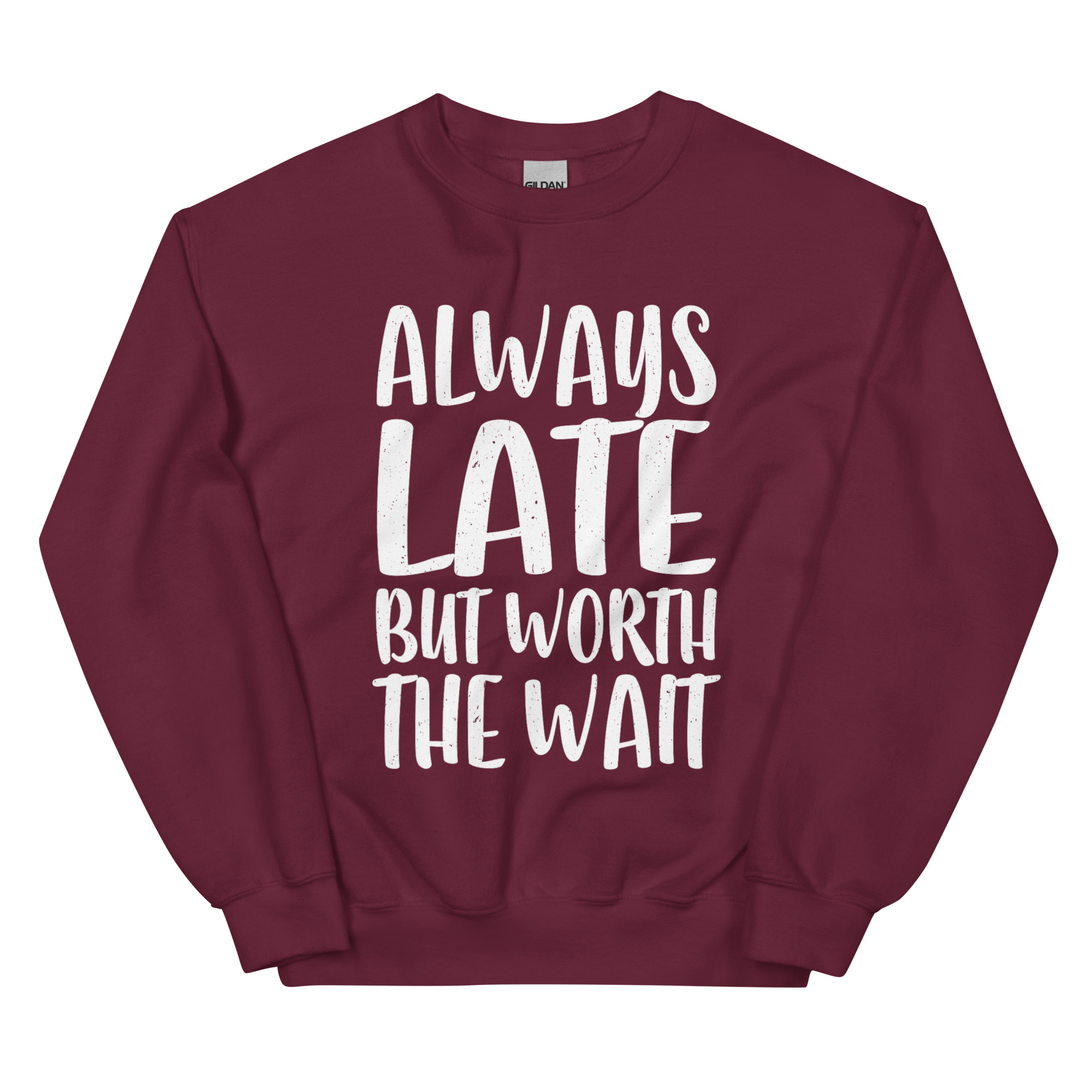 Always Late But Worth the Wait Unisex Sweatshirt A sturdy and warm sweatshirt bound to keep you warm in the colder months. A pre-shrunk, classic fit sweater that’s made with air-jet spun yarn for a soft feel.