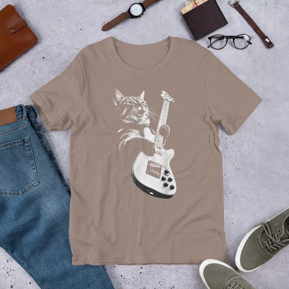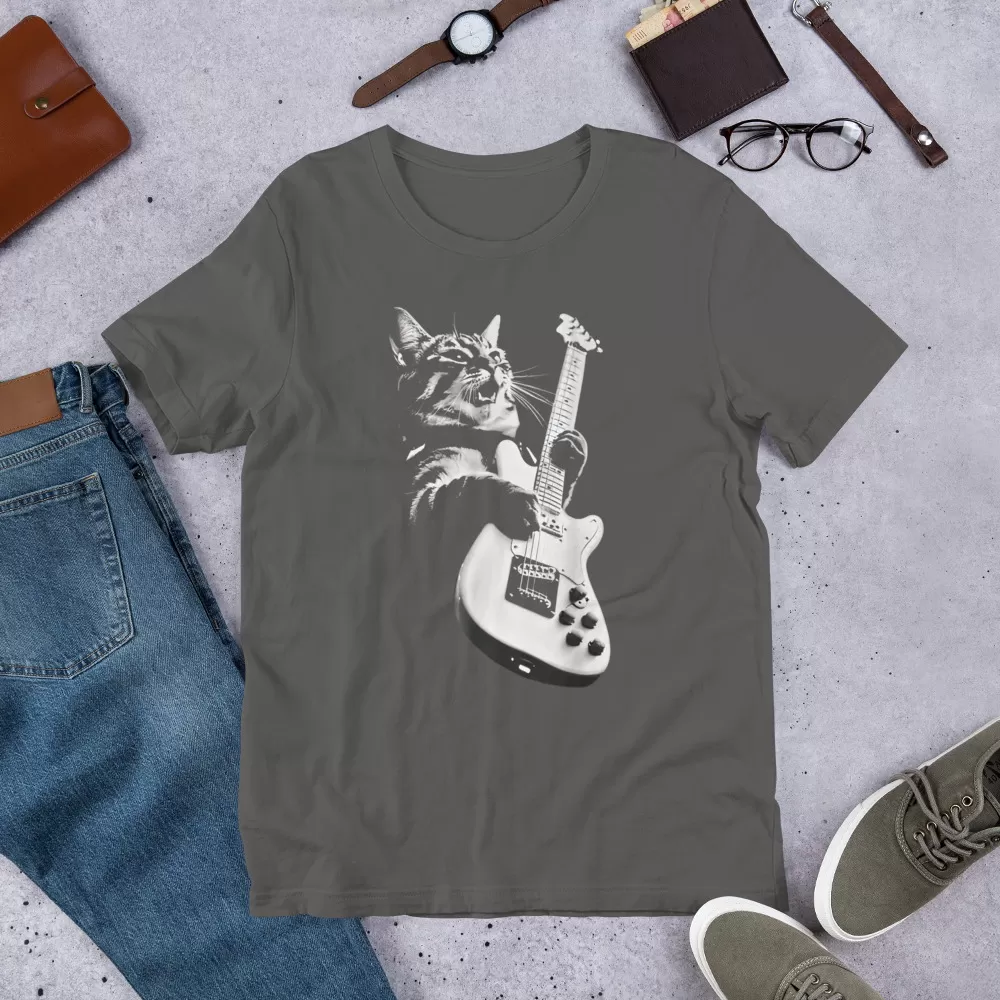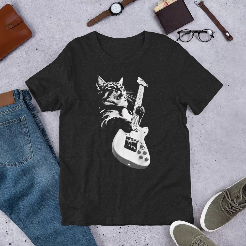 Cat playing guitar Unisex t-shirt This product is made especially for you as soon as you place an order, which is why it takes us a bit longer to deliver it to you. Making products on demand instead of in bulk helps reduce overproduction, so thank you for making thoughtful purchasing decisions!