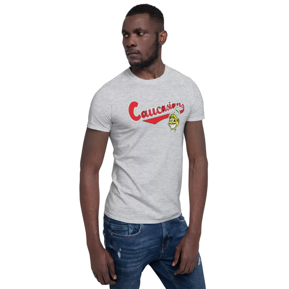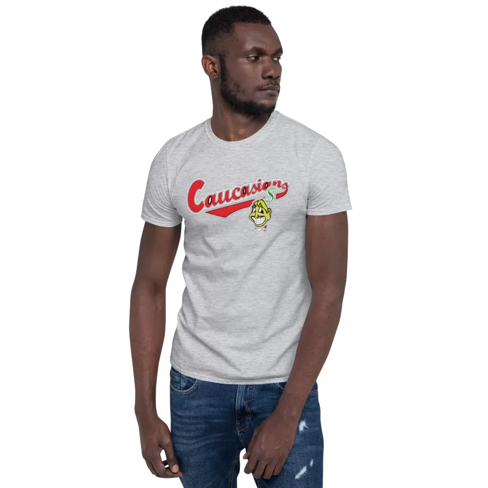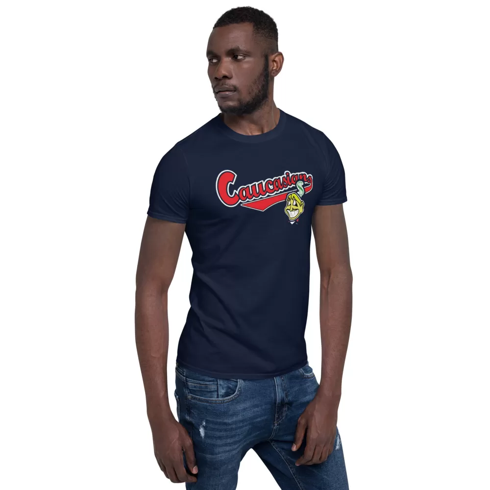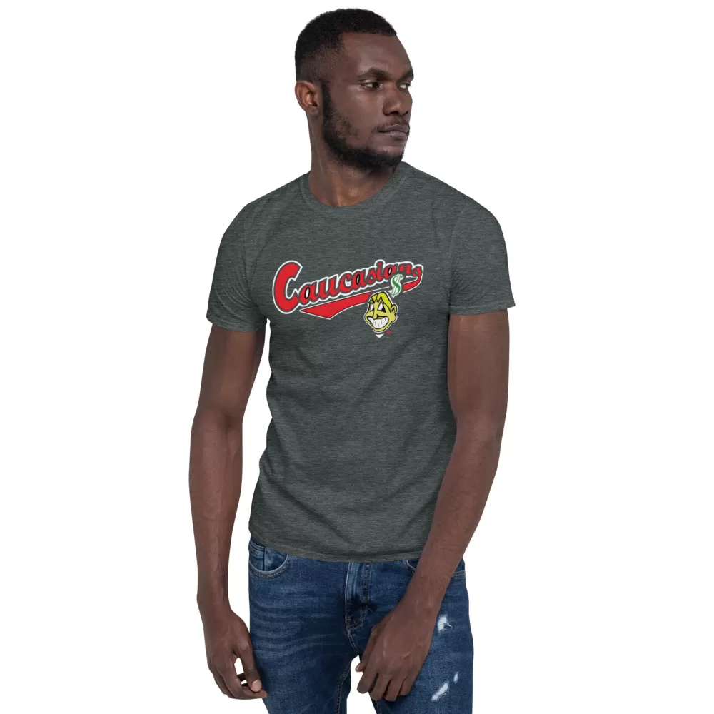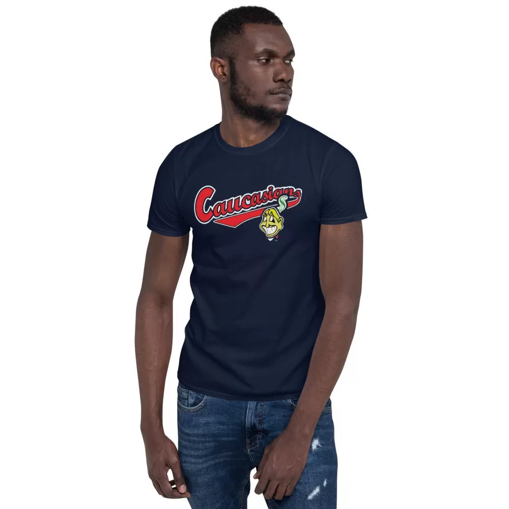 Cleveland Caucasians Mascot T-Shirt You’ve now found the staple t-shirt of your wardrobe. It’s made of a thicker, heavier cotton, but it’s still soft and comfy. And the double stitching on the neckline and sleeves add more durability to what is sure to be a favorite!