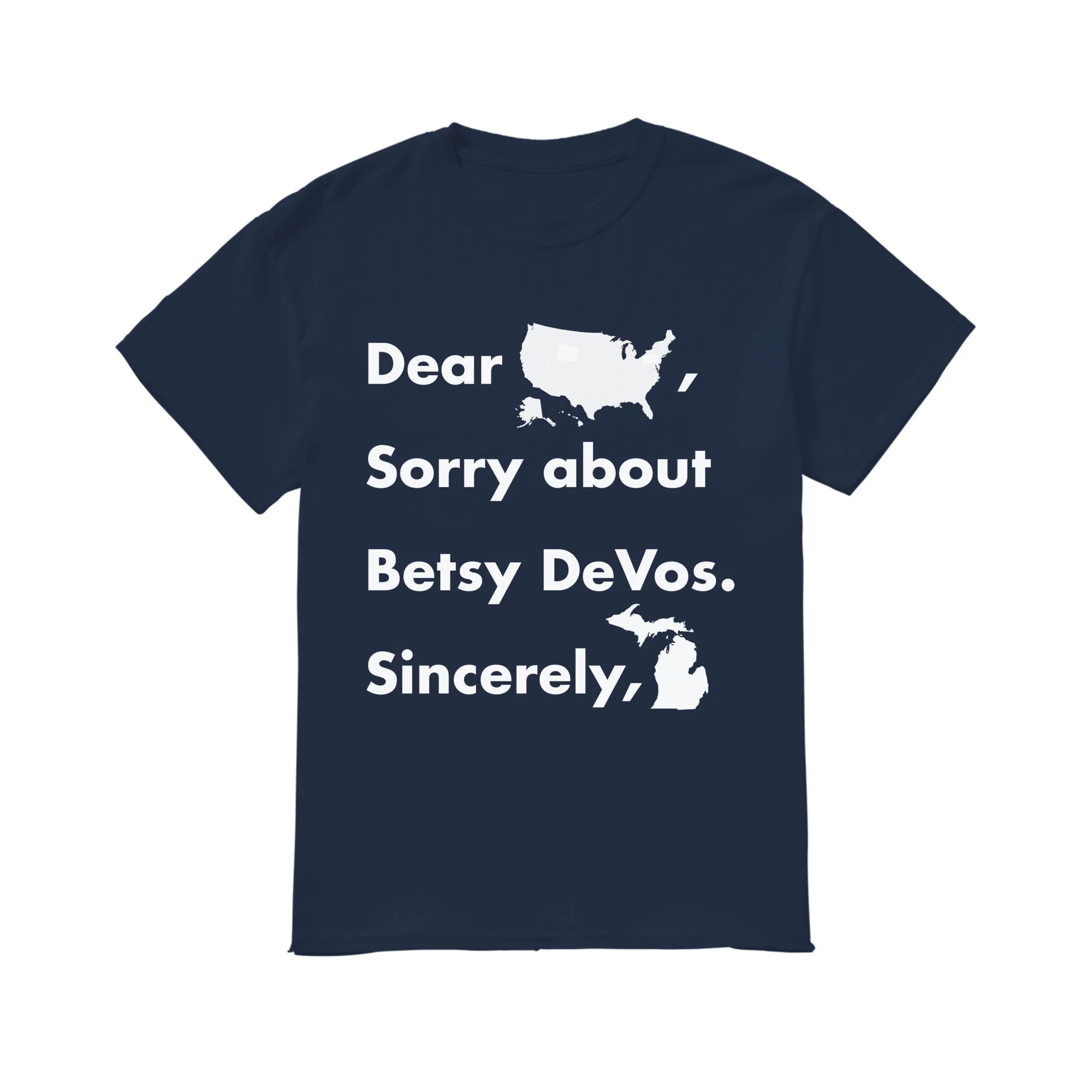 Dear America Sorry About Betsy devos Sincerely Michigan You’ve now found the staple t-shirt of your wardrobe. It’sade of a thicker, heavier cotton, but it’s still soft and comfy. And the double stitching on the neckline and sleeves add more durability to what is sure to be a favorite!