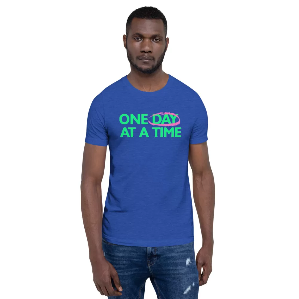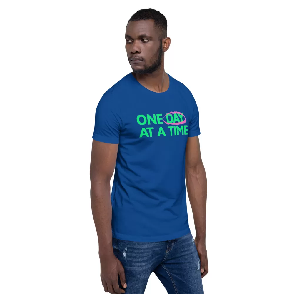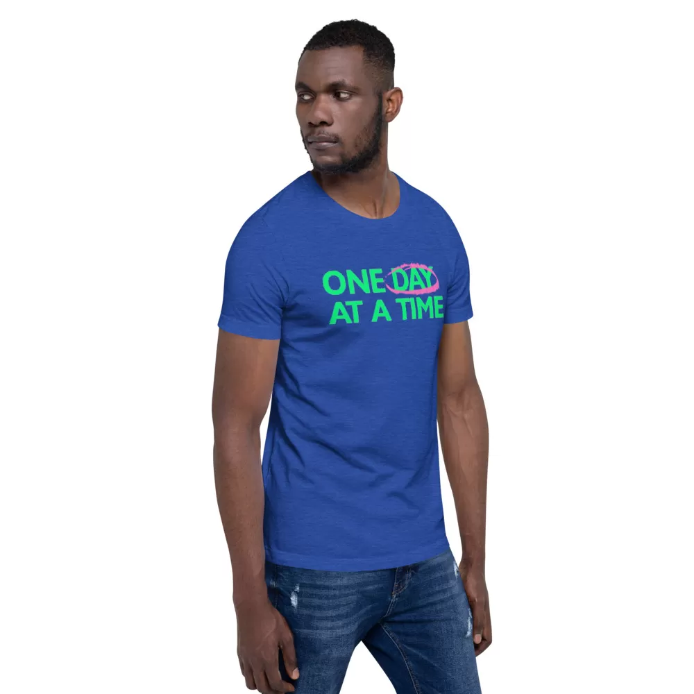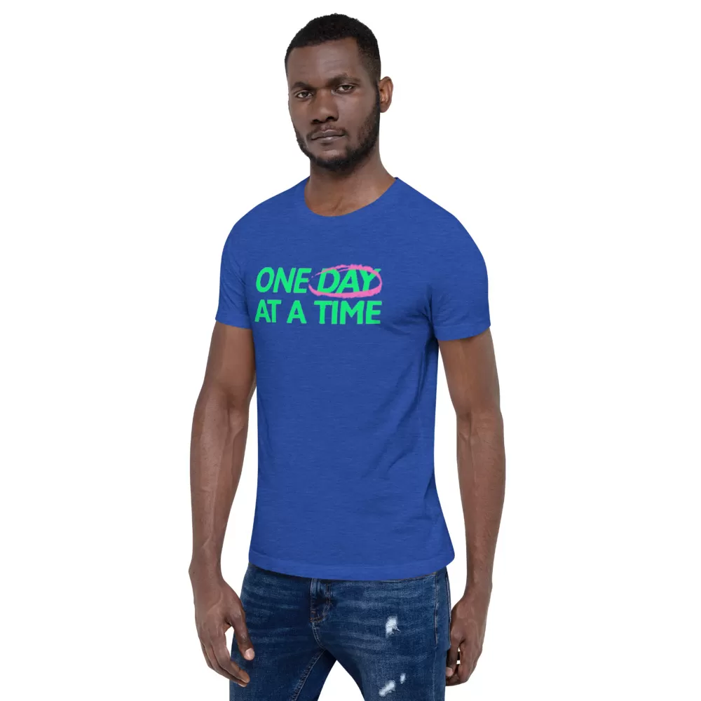 One day at a time unisex t-shirt This t-shirt is everything you’ve dreamed of and more. It feels soft and lightweight, with the right amount of stretch. It’s comfortable and flattering for both men and women.