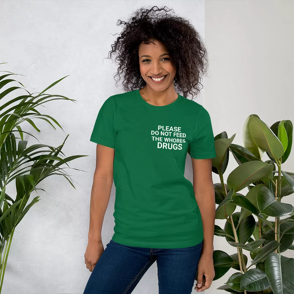 please do not feed the whores drugs This t-shirt is everything you’ve dreamed of and more. It feels soft and lightweight, with the right amount of stretch. It’s comfortable and flattering for both men and women.
