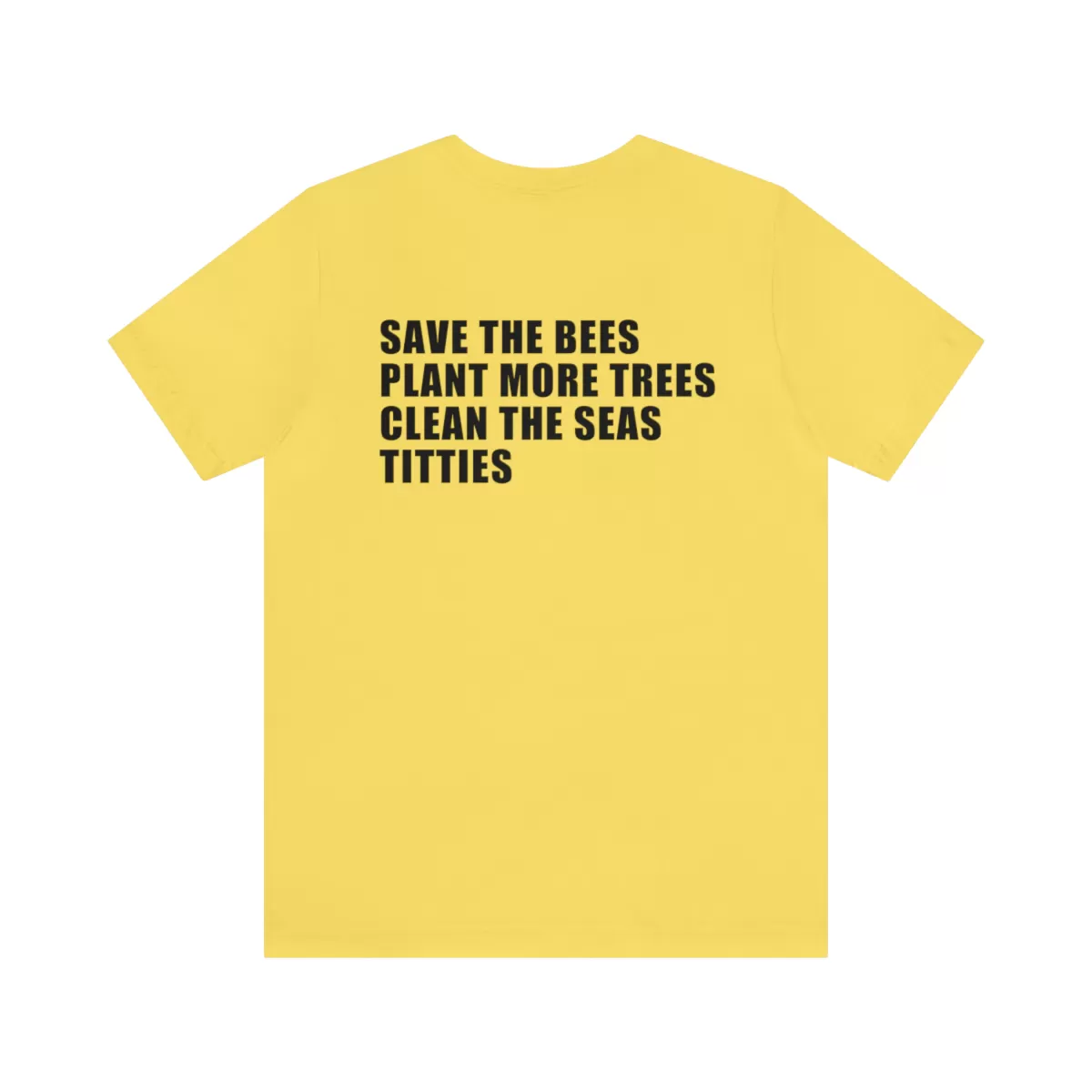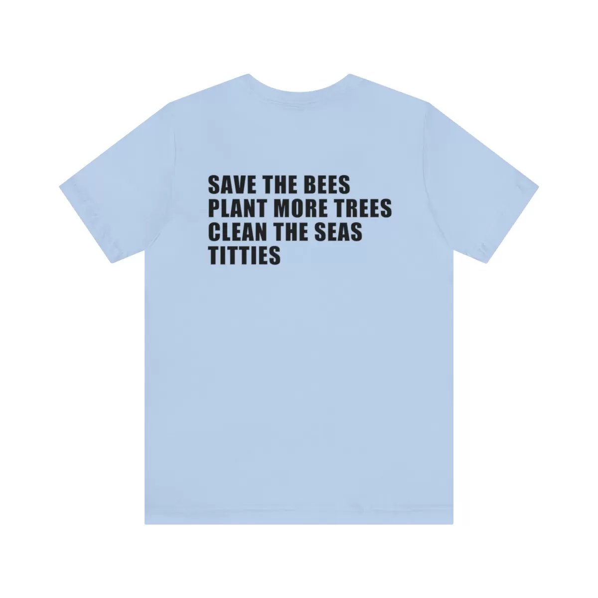 Save the beer plant more trees clean the titties This classic unisex jersey short sleeve tee fits like a well-loved favorite. Soft cotton and quality print make users fall in love with it over and over again. These t-shirts have-ribbed knit collars to bolster shaping. The shoulders have taping for better fit over time. Dual side seams hold the garment’s shape for longer.